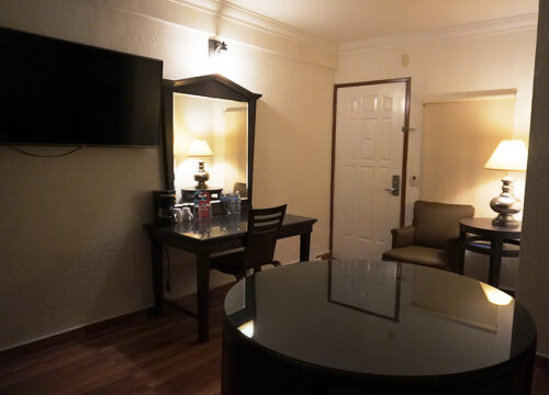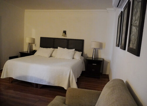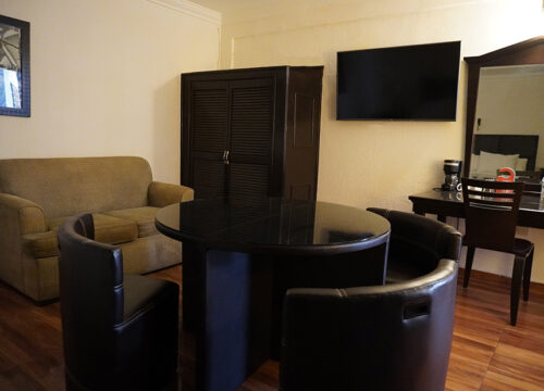 Su espacioso comedor para cuatro personas y el jacuzzi privado hacen de esta suite la opción perfecta para una estancia exclusiva. Además, cuenta con aire acondicionado, TV por cable, WiFi, refrigerador y estacionamiento dentro del hotel.